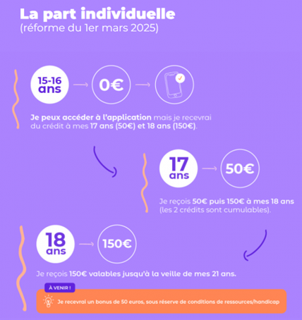 - Part individuelle : elle permet à tous les jeunes de 15 à 21 ans sur l’ensemble du territoire national de découvrir des propositions culturelles de proximité et d’y accéder en téléchargeant l’application pass Culture. Ils peuvent réserver des places et abonnements, des livres, des CD, des visites, des cours et ateliers, du matériel de beaux-arts, des services numériques, etc. Avant 17 ans, les bénéficiaires peuvent accéder à une sélection d’offres gratuites variées. Chaque jeune bénéficie à partir de ses 17 ans d’un crédit individuel attribué à titre personnel.